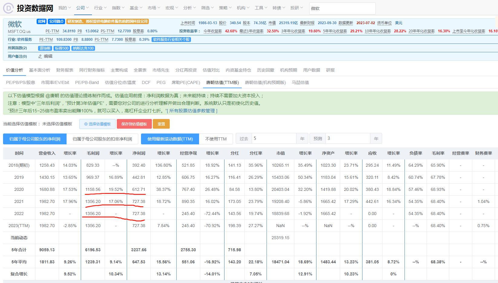 唐朝估值TTM模块:微软MSFT财报数据错位